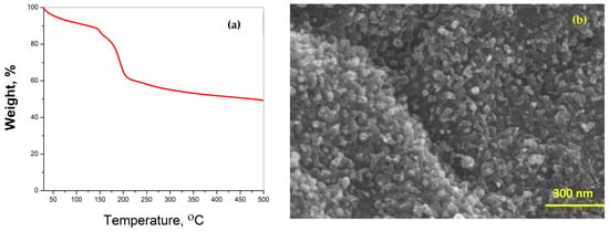 TGA thermograph (a) and SEM morphology (b) of ‘ash residue’ after TGA experiment.