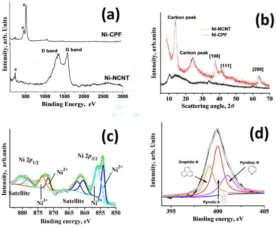 Raman spectra were carried out to study the structural properties of Ni-CPF and Ni-NCNT (Figure 3a), wherein the peaks associated with nickel are marked with #. In the case of Ni-NCNT, three describable peaks can be observed: one associated with nickel at 208 cm−1, attributed to the T2g symmetry; and two associated with the Raman active G and D band peaks at 1584 and 1352 cm−1, attributed to the in-plane vibrational mode and disorder induced by the presence of extensive defects, as observed in HRTEM in Figure 1d. In the case of Ni-CPF, the carbon-related Raman active peaks were absent, and the spectrum was dominated by intense peaks at 474 and 524 cm−1 attributed to the ring δas (C–C) of Dabco moieties in CPF. XRD peaks of the prepared Ni-CPF and its microwave-transformed Ni-NCNT are shown in Figure 3b. In the case of Ni-CPF, two broad diffraction peaks at 10.2° and 14.4°, corresponding to Ni-CPF (CCDC No. 638866) [] and two small humps at 33.8° and 60.2°, corresponding to the (108) and (200) planes of nickel (JCPDS No. 01–1260) can be observed. In the case of Ni-NCNT, the XRD spectra were dominated by a broad carbon peak at ~24.2° in addition to three sharp nickel related peaks at 13.5°, 37.5° and 63.3°. Since the EDS mapping images showed the extensive presence of nickel and nitrogen, XPS spectra were used to study the nature and extent of chemical moieties in Ni-NCNT. The freeware XPSPEAK ver. 4.1 was used to shape fit the Gaussian–Lorentzian type of high-resolution Ni 2p XPS spectra (Figure 3c), which shows four prominent peaks at 854.2, 961.23, 872.35 and 879.41 eV, corresponding to Ni 2p3/2 and its corresponding satellite peak and Ni 2p1/2 and its corresponding satellite peaks, respectively.