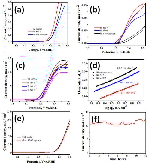 LSV curves of Ni-NCNT, Dabco Ni-CPF and NiO nanoparticles in 1 M KOH (a) and 1 M KOH with 0.33 M urea solution (b); LSV curves of Ni-NCNT at increasing scan rates (c); Tafel plot of Ni-NCNT, Dabco Ni-CPF and NiO in 1 M KOH with 0.33 M urea at a scan rate of 2 mV s−1 (d). LSV curves after 1000 cycles (e) and 12 h steady-state test (f).
