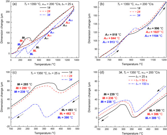 Dilatometric curves in CGHAZ. (a) complete dilatometric curves, (b) heating process, (c) cooling process, (d) 3#–the cooling process under different t8/5.