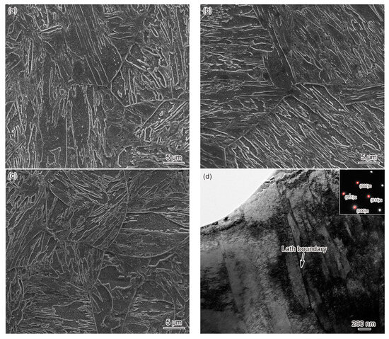 Microstructure of CGHAZ, t8/5 = 25 s: (a) 1#–SEM, (b) 2#–SEM, (c) 3#–SEM, (d) 3#–TEM.