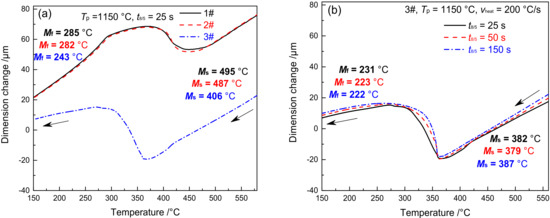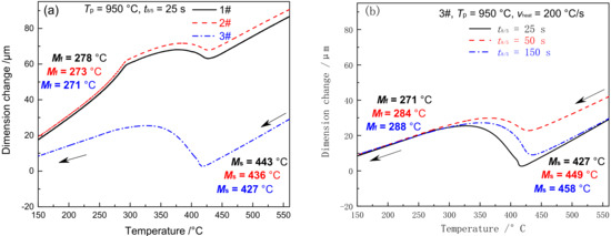 Figure 7 shows the dilatometric curves of ICHAZ in materials 1–3#. With the Tp of ICHAZ ranging between Ac1 and Ac3, the base metal was partially transformed into austenite and then into martensite during the subsequent cooling process. The parts left not transformed were over-tempered martensite [25]. Due to the difference in austenite content and alloy content in the austenite formed by materials 1–3# at Tp (Tp = 950 °C), the cooling transition curve differed to CGHAZ. The Ms and Mf of materials 1 and 2# were 443 and 278 °C, 436 and 273 °C, respectively, which are 50 and 7 °C and 46 and 7 °C lower compared to CGHAZ, respectively. The Ms and Mf of material 3# was 427 °C and 271 °C, respectively, which is 37 °C and 32 °C higher compared to CGHAZ. When t8/5 reached 25, 50, and 150 s, respectively, the Ms of material 3# was 427, 449 and 458 °C respectively, while the Mf was 271, 284, and 288 °C respectively, as shown in Figure 7b. It is indicated that both Ms and Mf rose slightly with the increase of t8/5. The above changes in Ms and Mf for materials 1–3# were closely associated with the amount of austenite formed and that of carbides redissolved at Tp.