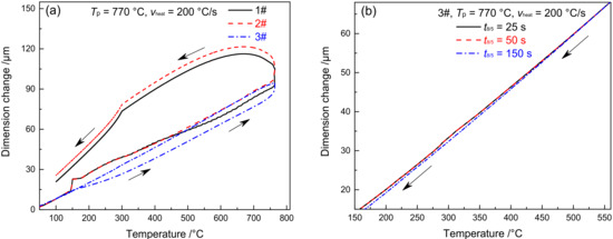 Dilatometric curves in SCHAZ (a) complete dilatometric curves, (b) 3#–the cooling process under different t8/5.