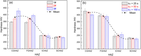 Microhardness of HAZ (a) materials 1–3# when t8/5 is 25 s, (b) material 3# under different t8/5.
