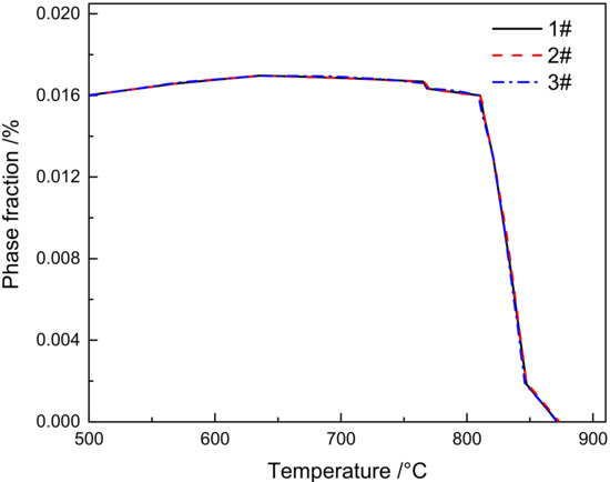 Thermodynamic calculation on the equilibrium precipitated phase of M23C6 in 1–3# materials was carried out using the TCFe9 database in Thermo-Calc software. As seen in Figure 12, which shows the effect of B content on the amount of M23C6 carbide, we can find that the B content within the range of 0–0.013% has no obvious influence on the content of M23C6 carbide.