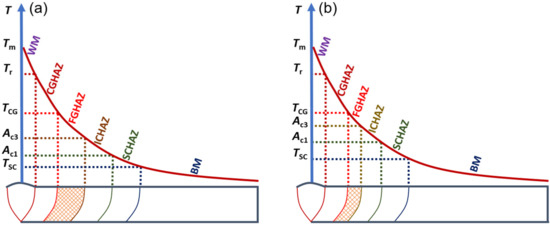 Figure 13 presents the schematic diagram of compression for FGHAZ in G115 steel by increasing the Ac3. Tm, Tr, TCG, TSC represent the weld joint peak temperature, the critical temperature of the welding fusion zone, the critical temperature of CGHAZ, and the critical temperature of SCHAZ, respectively. As shown in Figure 13, each subzone was taking shape in the HAZ of welded joints within a certain temperature range. The range of formation temperature for FGHAZ is Ac3–TCG. When TCG remained unchanged and Ac3 increased, the formation temperature range for FGHAZ was compressed, and the area of FGHAZ was reduced. That is to say, the shadow area in Figure 13 was significantly reduced, and the FGHAZ martensite content declined, which is effective in inhibiting the occurrence of type Ⅳ failure.