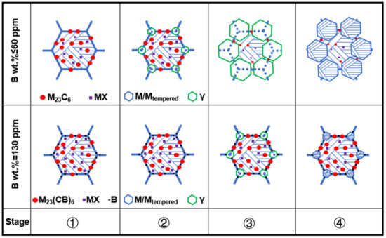 Effect of element B on ICHAZ microstructure evolution.① T < 818 °C, ② 818 < T < 913 °C, ③ 913 < T < 950 °C, ④ cooling from 950 °C to room temperature.