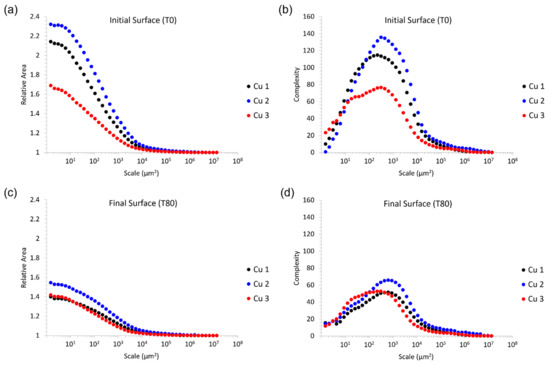 Initial vs. final surface finish. (a,c) Relative area compared for Cu 1–3, (b,d). Complexity compared for Cu 1–3.