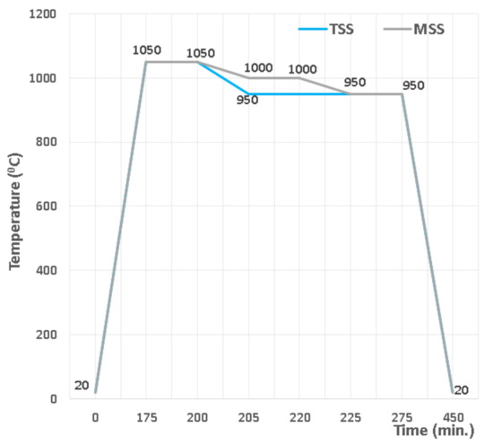 For the green compact’s densification, two sintering treatments were chosen, as shown in Figure 1.