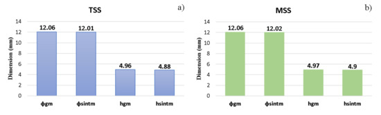 During the sintering process, the TiH2 precursor powder has suffered a dehydrogenation process leading to Ti-based alloy. After sintering, the variations in sample height and diameter during shrinkage were measured. In Figure 7, the graphical variations in average values of Ti-based sample heights and diameters for the TSS (Figure 7a) and MSS (Figure 7b) cycles are shown.