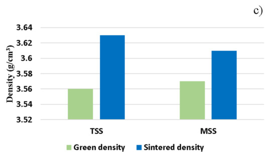 After compaction and sintering, the green and the final density of the parts have been established by measuring their dimensional sizes and weighing them with an analytical balance, and then, the density formula for cylindrical parts has been applied. In Figure 7c, a comparative analysis between the values obtained after compaction and sintering density for each sintering cycle is given