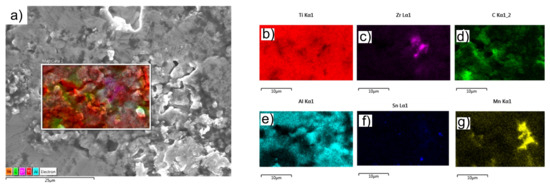 SEM image and EDXS elemental mapping for the sample obtained by TSS: (a) SEM image and overlayed maps, (b) Ti, (c) Zr, (d) C, (e) Al, (f) Sn and (g) Mn map distributions.