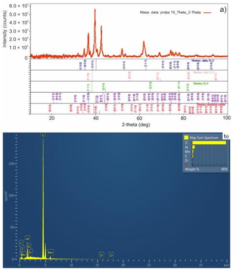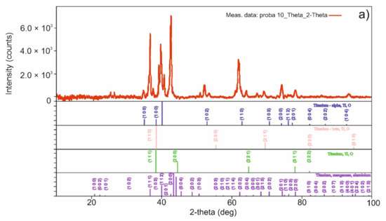 Using XRD analysis, crystalline phases present in the investigated samples were evidenced. Thus, in the sample obtained by TSS (Figure 10a) three crystalline phases ascribed to different titanium polymorphs were identified: cubic (space group F m—3 m), titanium beta with cubic symmetry (space group I m—3 m), titanium alpha with hexagonal symmetry (space group P 63/mmc). In addition to those, the characteristic reflexions of an intermetallic compound were evidenced (Ti:Mn:Al = 1/1.56/0.44, space group P 63/mmc, with hexagonal symmetry). The as-prepared sample showed a similar XRD pattern with the sample obtained in a single sintering step at 1100 °C [47]. We can conclude that the decrease in thermal treatment temperature from 1100 °C to 1050 °C and the addition of a second step at 950 °C lead to the same crystalline phases in the sinters. However, a decrease in the intensity of the characteristic peaks was evidenced, indicating a decrease in crystallite sizes as was expected. For the sample obtained by MSS (Figure 11a), a supplementary crystalline phase was identified beside the ones from TSS sample, namely titanium aluminum carbide (3/1/2) with hexagonal symmetry and space group P 63/mmc.