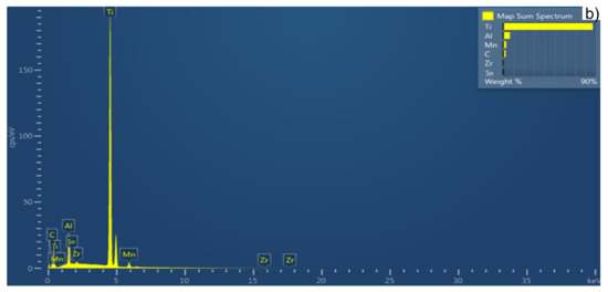 Figure 8 shows a relatively homogeneous distribution of Al in Ti matrix, while Zr, Mn and Sn formed islands in Ti matrix. TiH2 dehydrogenation during the sintering treatment is indicated by the presence of pure titanium grains in high ratio (over 87%; see Table 2). The high carbon content at the surface is due to the exposure of the surface layer of the parts to the environment when simultaneous oxidation and carburization of the surface layer occur [45,46,47].