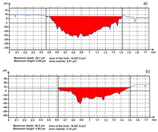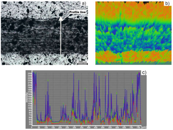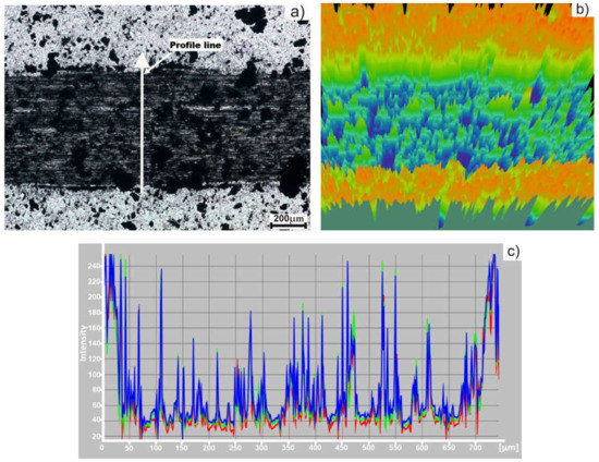 In Figure 12, the worn track of the sample and the intensity profile are presented. As it can be seen from the intensity profile (Figure 12c), the width of the worn track is about 700 µm. Also, the profile shows the non-uniformity of the worn track, which is in accordance with the penetration depth. The non-uniformity can be also seen in the 3D image (Figure 12b).