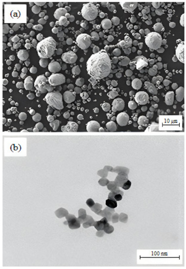 Morphologies of the powders: (a) FESEM image of 17-4PH stainless steel particles; (b) TEM image of zirconia particles.