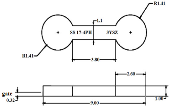 Schematic of the 17-4PH/zirconia micro-sized component (all dimensions are in mm), reused with permission from Elsevier [18].