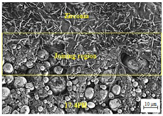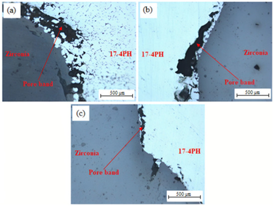 The SEM images of the 17-4PH/zirconia micro-parts sintered at 1250 °C, 1300 °C, and 1350 °C with a holding period of 3 h are exhibited in Figure 9. Based on Figure 9a, the partially bonded interface of 17-4PH and zirconia had cracks when the micro-sized specimen was sintered at 1250 °C. During sintering, mismatch strains are produced at the interface as a consequence of the predisposition of different layers of materials to shrinkage at different rates [36]. Such differences in shrinkage rates cause delamination, pore-band formation, and cracking in the bonding region due to bi-axial mismatch stresses [37]. The partial bonding of the specimen was improved when the temperature was enhanced to 1300 °C, as displayed in Figure 9b. As shown in Figure 9c, 17-4PH and zirconia had a strong bond when sintering was performed at 1350 °C; this was attributed to an adequate reduction in mismatch shrinkage. Figure 10 depicts EDS mapping. Iron (Fe), zirconium (Zr), chromium (Cr), oxygen (O), yttrium (Y), and nickel (Ni) were present at the 17-4PH/zirconia interface of the micro-sized component. The inter-diffusion of elements at the interface was caused by their higher affinity toward the oxygen of the zirconia ceramic, which ultimately caused bonding between 17-4PH and zirconia due to oxide layer formation [38]. Figure 11 illustrates the microstructures of the 17-4PH/zirconia micro-sized components sintered at different temperatures with the existence of pore bands. As Ni and Cr possess greater diffusion coefficients in Fe than Zr diffusing from the opposite side, vacancies develop in the vicinity of the 17-4PH stainless steel portion, creating pore bands [39].