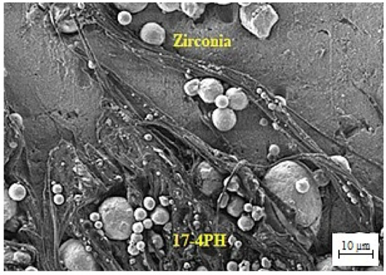 FESEM image of the green 17-4PH/zirconia micro-specimen.