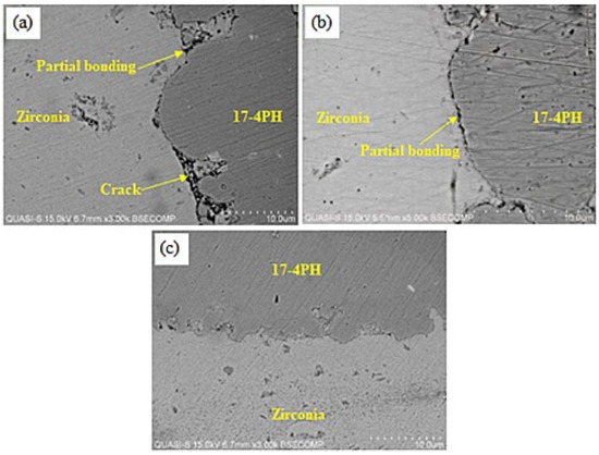 SEM micrographs exhibiting the interfaces of 17-4PH/zirconia micro-sized components sintered for 3 h at various temperatures: (a) 1250 °C; (b) 1300 °C; (c) 1350 °C.