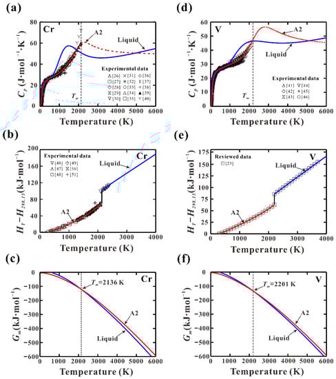 Figure 1a,d show the calculated Cp of pure Cr and V in their solid A2 and liquid states. The experimental Cp data [26,27,28,29,30,31,32,33,34,35,36,37,38,39,40,41,42,43,44,45,46] are also appended in the figure for comparison, showing a nice agreement with present calculations. Figure 1b,d show the calculated HT-H298 of pure Cr and V from 298 to 4000 K together with the reported data [23,47,48,49,50,51]. An excellent agreement can be observed. The Gibbs energies of solid A2 and liquid phases in pure Cr and V from 0 K to 6000 K were calculated and displayed in Figure 1c,f, revealing the lattice stability over the whole temperature range.
