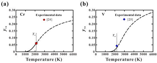 Figure 2 shows the calculated thermal vacancy concentrations in solid Cr and V. As can be seen, the thermal vacancy concentrations increase with the increase in temperatures, and a dramatic increase can be observed near the melting points. Besides, the present predicted thermal vacancy concentrations are in good agreement with those from measurements [24,25] at melting points. The above results indicate the reliability of the established third-generation Gibbs energies for pure Cr and V.