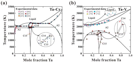 Calculated phase diagrams for (a) Ta-Cr and (b) Ta-V binary systems along with experimental data [63,64,65,66,67,68,69,70,71,72].