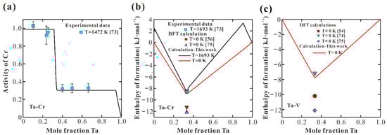 Calculated thermodynamic properties in Ta−Cr and Ta-V systems together with reported data [54,56,73,74,75]: (a) activity of Cr in Ta-Cr system at 1472 K; (b) enthalpy of formation in Ta-Cr system at 0 and 1693 K; (c) enthalpy of formation in Ta-V system at 0 K.