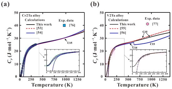 Calculated Cp for (a) Cr2Ta and (b) V2Ta alloys from 0 to 1400 K along with the reported data [76,77].