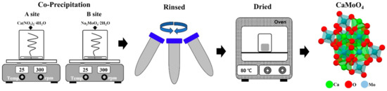 Two beakers were prepared to synthesize crystalline CaMoO4 by co-precipitation at room temperature. Here, 1 mmol of calcium nitrate and 100 mL of distilled water were added to beaker “A” and stirred. The same moles of sodium molybdate and distilled water were added to beaker “B”, which was stirred until they were completely dissolved. After 1 h, the two solutions were confirmed to be completely dissolved, and the solution was slowly poured from beaker “B” into beaker “A” and stirred for 3 h. Centrifugation was then conducted to recover the reacted white powder, and the powder was recovered after washing twice to remove the unreacted substances and sodium. The recovered powder was placed in an oven at 80 °C and dried for about 12 h. To use crystalline CaMoO4 as a phosphor material, 0.25 mmol of rare-earth ions (terbium (III) nitrate; Tb3+, europium (III) nitrate; Eu3+) were added to beaker A during the co-precipitation step, and were synthesized using an identical process (Figure 1).