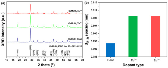 (a) XRD patterns and (b) d(112) spacing of CaMoO4 and CaMoO4:RE3+.