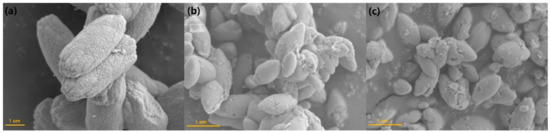 FE-SEM images of (a) CaMoO4, (b) CaMoO4:Tb3+, and (c) CaMoO4:Eu3+.