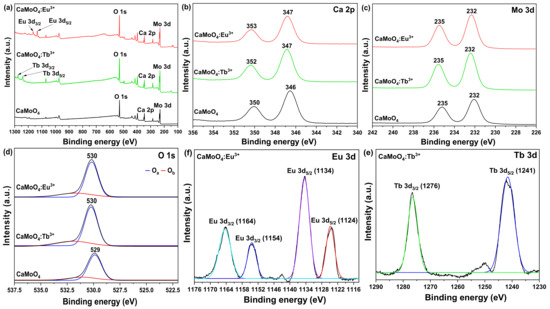 (a) XPS survey, (b) Ca 2P, (c) Mo 3d, (d) O 1s, (e) Tb 3d, and (f) Eu 3d spectra of CaMoO4 and CaMoO4:RE3+.