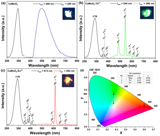 PLE and PL spectra of (a) CaMoO4, (b) CaMoO4:Tb3+, (c) CaMoO4:Eu3+, and (d) CIE coordination.
