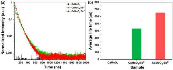 In addition, we measured the time-resolved photoluminescence (TRPL) for the luminescence dynamics of CaMoO4 and CaMoO4:RE3+, as shown in Figure 6a. After an analysis of the TRPL [34,35], the excitation wavelength was found to be 315 nm. The wavelengths used for the analysis were those of CaMoO4, CaMoO4:Tb3+, and CaMoO4:Eu3+ emitted at 498 nm, 544 nm, and 613 nm, respectively. Figure 6b shows that the average decay time (τavg) elapsed slowly. It is believed that the light energy received from the host is transferred to the doped rare-earth ions as an activator and that the light emission lifetime of the rare-earth-doped sample is longer than that of the undoped sample due to the mechanism used by the phosphor to emit light (CaMoO4 = Non, CaMoO4:Tb3+ = 431 μs, CaMoO4:Eu3+ = 654 μs). Zhu et al. observed changes in properties according to the changes in structure, surface shape, and pores according to the doping amount of the carbon material when manufacturing a composite in which a carbon material and a conductive material were mixed. It was announced that the characteristics of a supercapacitor were strengthened by utilizing the characteristics changed by the doping material [36]. In this study, it was found that the structure, particle size, and surface shape of CaMoO4 were changed by the addition of rare earth, and the luminescence properties were strengthened. Table S1 compares the properties of CaMoO4 phosphors doped with rare earths synthesized by other methods. It can be seen that the synthesis method presented in this work is easy and can be synthesized at room temperature without additional heat treatment, and the luminescence properties are strong.