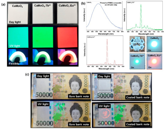 First, 1 wt% of the synthesized CaMoO4 and CaMoO4:RE3+ phosphors were mixed with 5 g of polydimethylsiloxane (PDMS), and were poured into a square mold, put in a vacuum oven at 80 °C, and cured for 2 h to prepare a flexible composite. The prepared composite was photographed for comparison with typical daylight and a UV-lamp, and the color change was observed and photographed by placing it on a UV-LED chip. An anti-counterfeiting ink was prepared by mixing 0.5 wt% of phosphor powder synthesized by doping with rare-earth ions, glycerin (2 g), and ethyl alcohol (4 g). The prepared ink was applied to a bank note with a brush and was examined with the naked eye and under a UV lamp.