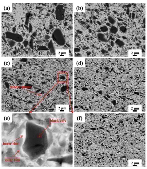 - The cermets with 1.5 wt.% SiCp and 0.5 wt.% SiCw addition appeared to be the best comprehensive properties, and the strength, hardness, and fracture toughness reached 2520.8 MPa, 88.0 HRA, and 16.56 MPa·m1/2, respectively. The synergistic strengthening and toughening effect afforded by the reasonable SiCp and SiCw could be confirmed, and the smallest grain size, most uniform, and completed core-rim structure of the cermets were achieved.