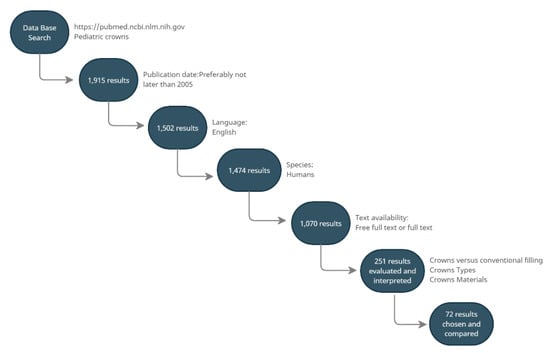 It should be noted that the quantitative compositions of individual brands of preformed pediatric crowns can vary. The information on composition was gathered from product safety data sheets. The selected publications contain a thorough description of each group of crowns, their properties, advantages, disadvantages, indications, contraindications, preparation protocols, and treatment results (Figure 1) [18].