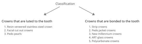 Prefabricated crowns have been widely used in pediatric dentistry for the last 50 years [19]. The three recently most used ones are preformed metal crowns, resin veneered stainless steel crowns, and strip crowns [20]. More aesthetic solutions include pre-veneered crowns and zirconia crowns. The use of pediatric crowns involves the proper preparation of the tooth crown for it to fit well, or it may involve no preparation and the use of the Hall technique. In the Hall technique, the reconstruction of the tooth is performed without local anesthesia by placing the crown on the remaining tooth tissue and pressing it to the correct position using finger pressure or the patient’s occlusion force. The use of crowns is especially recommended for teeth after pulp treatment or with advanced decay damage. They are also a good solution in the case of developmental disorders of dental hard tissue. They can also be used as a method of reconstruction of deciduous teeth during procedures under general anesthesia. Their primary purpose is to allow tight restoration, with a long-term positive outcome and without major failures. The overall procedure should cause as little pain and as little trauma for the young patient as possible. Innes et al. in their systematic review conclude that the use of crowns is associated with a reduced risk of major failure, pain, and formation of abscess in the long term compared to conventional restorations. The use of crowns may be associated with a higher risk of gingival bleeding [17]. There are a small number of studies comparing different types of crowns. Therefore, we cannot, in the current state of knowledge, say which crowns are best. This refers to the use of zirconia crowns as a replacement for stainless steel crowns [21]. Pediatric crowns should be easy to adapt, the bonding strength should be high enough to withstand masticatory forces. Crown materials should be safe for antagonist teeth. They should not hamper oral hygiene maintenance and should be biocompatible with the surrounding tissue [22,23,24]. Sahana S et al. divide crowns into two groups (see Figure 2) [25].