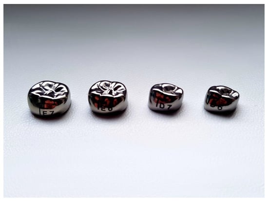 Preformed metal crowns (PMCs) can be divided into two groups depending on the composition. The first group is represented by stainless steel crowns (SSCs), while the second group include nickel-chromium crowns [19]. SSCs were introduced to dentistry in 1950. Their first prototypes were usually too large, with straight and very long sides. Proper adaptation to teeth required many steps such as trimming, contouring, crimping, and finishing [26,27]. The next generation of SCCs was focused on improving the imitation of natural tooth anatomy, which would help simplify the adaptation process. Introducing nickel-chromium crowns helped eliminate many disadvantages found in the first SSCs. Firstly, Cr-Ni crowns are fully shaped and resistant to defects [27]. Secondly, thanks to improved anatomical accuracy, they rarely require trimming [27]. It is worth noting that they also need to be modified to improve adaptation, but they usually need fewer steps to achieve it. Figure 3 presents an example of modern preformed metal crowns available on the market (below).