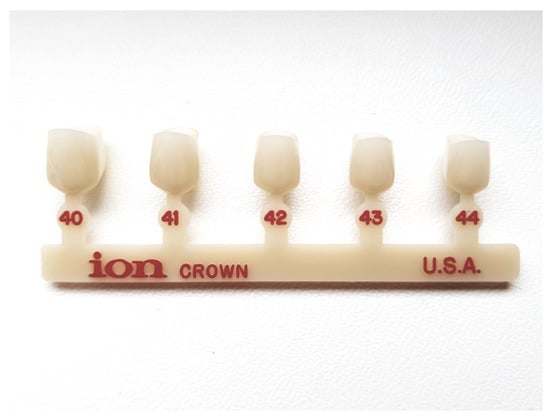 Anterior primary teeth are usually damaged due to early childhood caries (ECC) caused by bottle feeding without proper hygiene. ECC usually starts on the labial surface of the upper incisors and progresses rapidly. The treatment depends mostly on the cooperation with the patient and includes non-restorative cavity control, preparation, and restoration with conventional materials. Crowns can also be used for restoration and are especially useful when the caries damage is extensive and conventional restoration might be problematic. Polycarbonate crowns are made of aromatic polyesters of carbonic acids [19,54]. They can be described as thermoplastic resins. The use of high temperature (around 130 °C) and pressure makes the material easy to mold and shape into the desired form [19,54]. The material properties are thin structure and flexibility greater than that of acrylic resin crowns [64]. On the other hand, these crowns do not resist high abrasive forces which can cause fracture or premature crown loss [64]. Figure 6 presents an example of polycarbonate crowns available on the market (below).