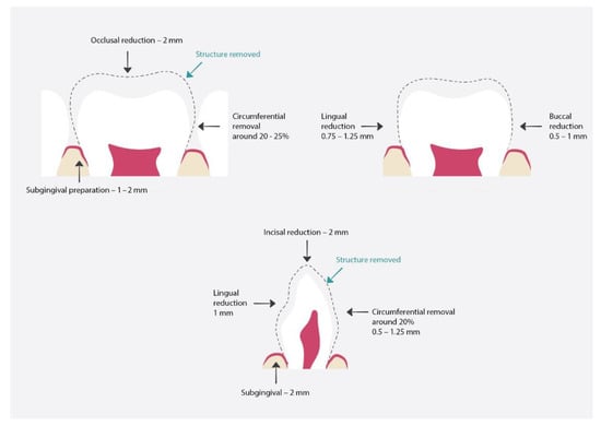 - Occlusal reduction around 2 mm or incisal reduction around 2 mm;