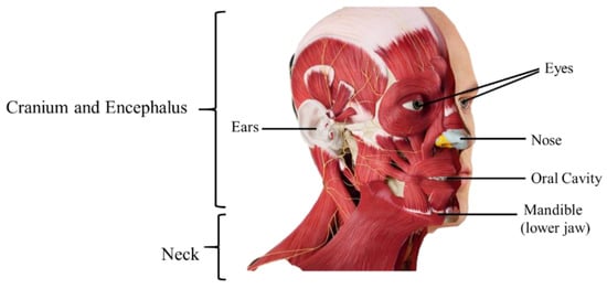 In the head (Figure 1), there are also the sensitive receptors (eyes, mouth, ears, and nose); the structures for transmission of voice and expression; and the entrances for nutrients, water, and oxygen and the exit of carbon dioxide. The skull, the bony part of the head, supports the face and protects the brain, and it is composed of two parts, the neurocranium (bone box of the encephalon and cranial meninges) and the viscerocranium (bones of the face). The neurocranium is covered with subcutaneous tissue and skin (part of this skin forms the scalp) []. For the face there is a set of bones, the facial bones, which form the nasal cavity, surround the eyeballs, and support the teeth of both jaws. The skull of an adult has 22 individual bones, of which only one is a moving bone, which is the mandible (lower jaw). The remaining 22 bones are immobile and are united in a single unit [].