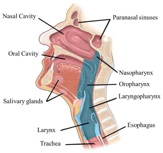 The upper aerodigestive tract is located throughout the head and neck region. It includes the oral cavity, oropharynx, laryngopharynx, larynx, nasopharynx, salivary glands, and nasal cavity (Figure 2). The production and articulation of speech, swallowing, and respiration are functions controlled by the oral cavity, pharynx, and larynx. In addition, these structures also protect the airways [,]. Damage to one of these structures may affect the functioning of the others. For example, during swallowing it is essential to protect the airways; otherwise, aspiration may result. The oral cavity, besides being involved in phonation, also controls the voluntary phase of swallowing, namely, chewing, preparing the cake, and delivering it to the oropharynx [].