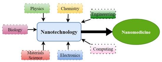 Nanotechnology is a multifaceted science that combines research fields (Figure 3). Its uses in healthcare come under nanomedicine, which uses molecular tools for diagnostic procedures, treatment, and prevention of diseases (e.g., cancer) [,]. Like nanotechnology, the definition of nanomedicine is not agreed on. It concerns a range of particles, which should be at the nanoscale, between 1 and 1000 nm [,,,,]. The goals of nanomedicine are common to those of traditional medicine, being earlier diagnosis, the development of non-invasive and effective treatments, and the minimization of side effects [].