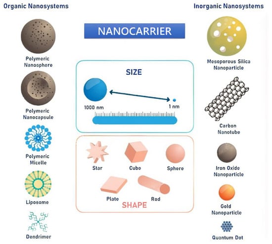 Organic and inorganic nanosystems for drug delivery and diagnostic applications. Size range and different shapes of nanosystems.