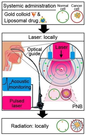 In this sense, early diagnosis is fundamental to reducing the involvement of other organs and structures, and to improving the prognosis of the disease once the success of the therapy is promoted by early initiation. Conventional cancer treatment protocols include local surgery combined with adjuvant systemic therapies—namely, the administration of cytotoxic drugs and the application of radiation. However, these are invasive methods and are associated with several serious side effects that compromise the patients’ quality of life, such as severe toxicity, mucositis, dysphagia, xerostomia, radiation dermatitis, hematologic toxicity, neurotoxicity, and ototoxicity [,]. The fact that these anticancer drugs cannot discriminate normal healthy cells from tumor cells results not only in side effects, but in, low concentrations reaching the target zones, compromising the therapeutic effect.