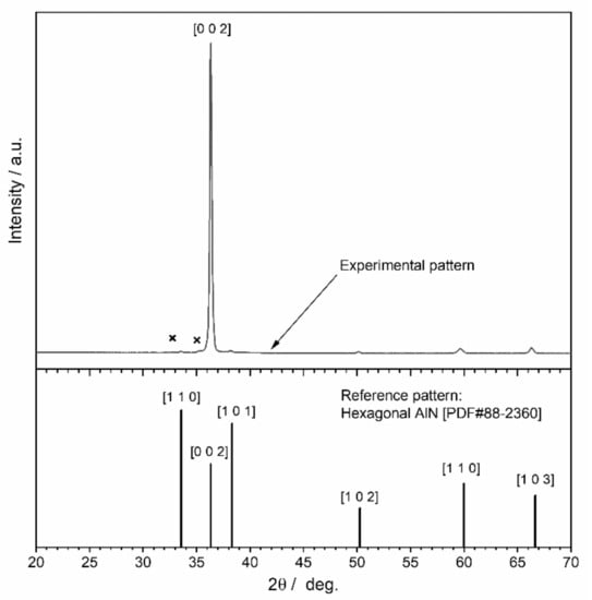 As indicated, a clear X-ray diffraction pattern could be obtained only for the film developed in the condition of nitrogen concentration of 0.8 (Figure 4). Most of the peaks in the pattern are consistent with the diffraction lines of hexagonal AlN (PDF#88-2360). Very weak extra peaks (marked with ‘X’ in Figure 4) are of doubtful attribution; a possible explanation, at least for the peaks at 2θ~35.5°, could come from traces of cubic AlN polymorph (PDF#80-0010). It must be noted that the experimental pattern matches with the reference pattern in terms of peak positions but not in terms of relative intensity. In fact, the very high intensity of the peak attributed to [0 0 2] planes could be due to anisotropic crystal growth along the c-axis; such preferential orientation nearly suppressed signals corresponding to other planes. In particular, peaks attributable to [1 1 0] and [1 0 1] planes, i.e., the strongest lines in the reference pattern, are hardly visible.