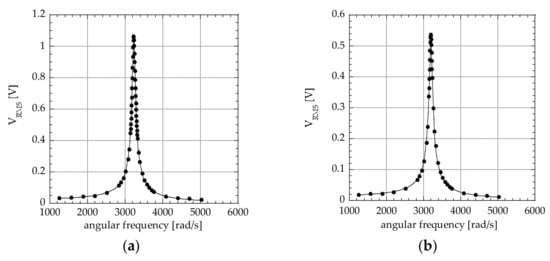 Figure 5. Output voltage (RMS value) VRMS experimental data obtained by cantilever beam set up with ERMS = 9.81 m/s2: (a) nitrogen concentration of 0.4; (b) nitrogen concentration of 0.8.