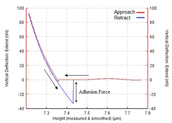 - Deposition on the substrate’s surface or AFM tip can affect the surface energy, the surface roughness, and Young’s modulus, which are the main parameters for the characterization of adhesion force.